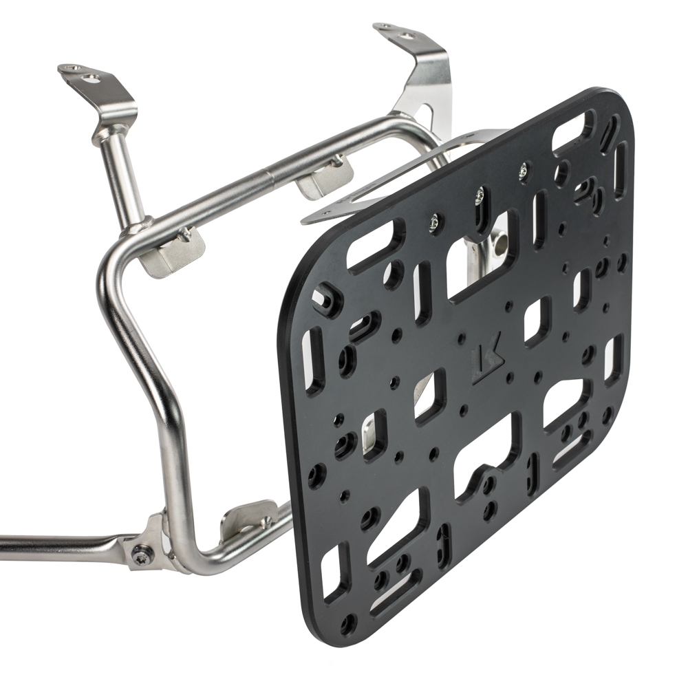 BMW Motorrad GS ADVENTURE pannier frames are designed to mount aluminium cases and do not have a standard flat profile on the exhaust side. This special edition OS-PLATFORM includes a stainless steel adaptor to flatten the profile and provide a strong mounting location for the OS-PLATFORM, which then gives you the option to mount Kriega ‘Soft Luggage’.